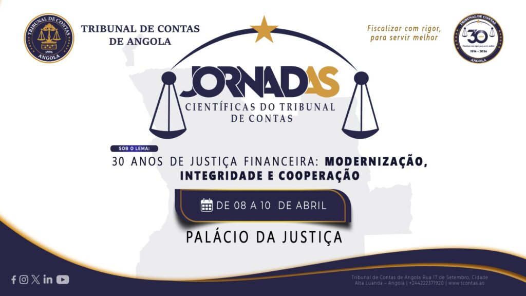 O Tribunal de Contas de Angola realiza, de 8 a 10 de Abril de 2026, no Palácio da Justiça, em Luanda, as Jornadas Científicas alusivas ao seu 30.º aniversário, sob o lema “30 Anos de Justiça Financeira: Modernização, Integridade e Cooperação”. A iniciativa enquadra-se nas celebrações oficiais dos 30 anos da criação da instituição, formalmente […]